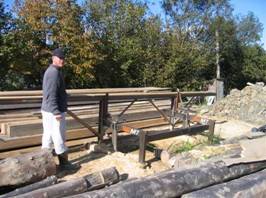 (gefällte Bäume auf unserem Bauland) (unser transportable Sägewerk)