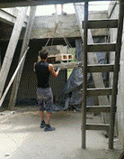 Weil die Wetterbedingungen fürs Betonieren immer wieder einmal nicht gepasst haben war ich gezwungen mir etwas einfallen zu lassen. Gemeinsam mit den Burschen haben wir eine sehr einfach zu be-dienende Vor-richtung mit elektrisch betriebener Verdichtung zur Herstellung speziell geformter Betonsteine entwickelt, die wir im ausgehärteten Zustand in den Regenpausen vermauern können.